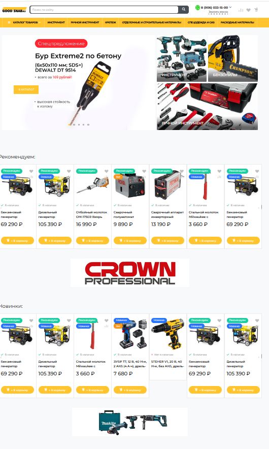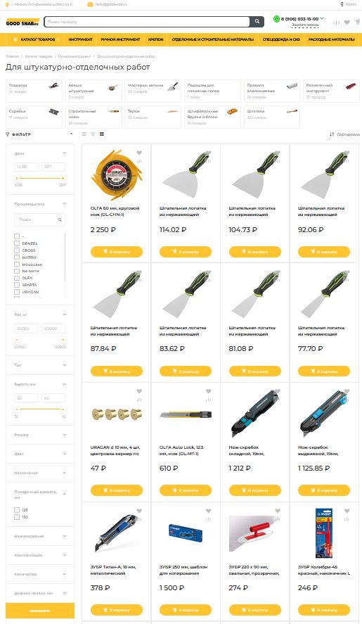 В каталоге товаров представлен широкий ассортимент продукции, включая строительные инструменты, материалы и оборудование. Товары распределены по категориям, каждая из которых содержит карточки с детальным описанием, характеристиками, ценами и фотографиями. Наполнение каталога производится в автоматическом режиме из прайс-листов и систем поставщиков, с последующей корректировкой товарной категории в соответствии со структурой каталога. Обновление цен, остатков, позиций производится автоматически по расписанию.