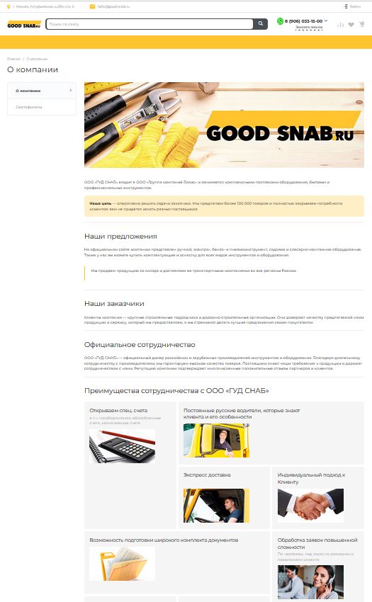 Сайт good-snab.ru - интернет-магазин, специализирующийся на комплексном снабжении строительных площадок и бригад по всей России. Разработан на платформе 1С-Битрикс:Управление сайтом, редакция «Бизнес», что обеспечивает стабильную работу, безопасность и удобство управления контентом, потенциал масштабирования.